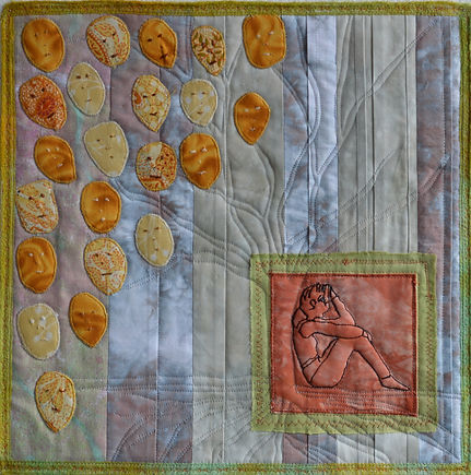 Techniques: Satin stitch appliqué, raw edge appliqué, decorative stitch appliqué, hand dyeing, free motion machine quilting, fabric manipulation, piecing and hand embroidery.